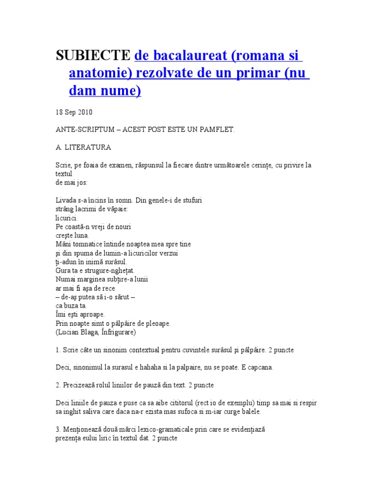 Subiecte Bac Romana 2012 - Subiecte, variante si rezolvari pentru examene nationale 2018: Subiect model limba romana ... : Pentru 3 iulie este programata.. Bacalaureat 2012 subiecte la romană scris date azi la bac 2012. Redactarea unui eseu având la baza versuri ale lui. Adaugat in july 2, 2012. Peste 2.400 de liceeni din alba susţin prima probă scrisă de la bacalaureat. Examenul național de bacalaureat 2020 a început luni, 22 iunie, cu proba scrisă la limba și literatura română.